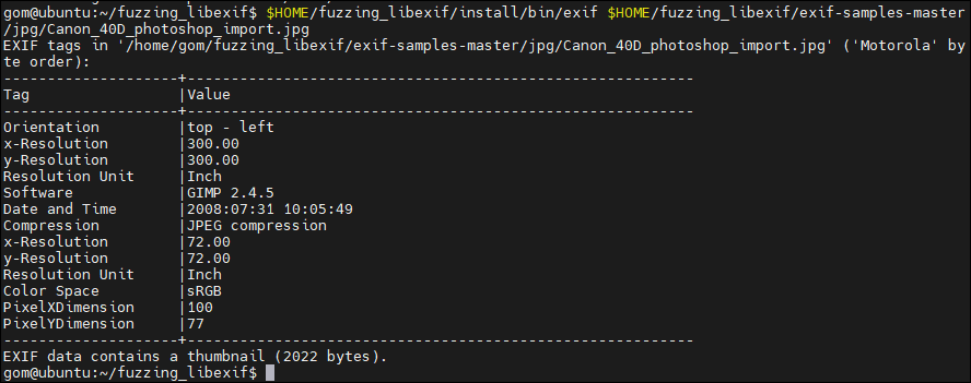 $HOME/fuzzing_libexif/install/bin/exif $HOME/fuzzing_libexif/exif-samples-master/jpg/Canon_40D_photoshop_import.jpg
