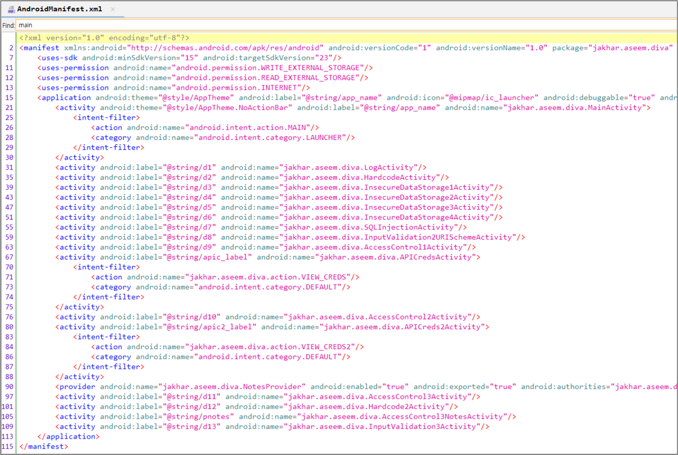 | 21~30 | <action android:name="android.intent.action.MAIN"/> | 메인 액티비티(MainActivity) ("jakhar.aseem.diva.MainActivity") |