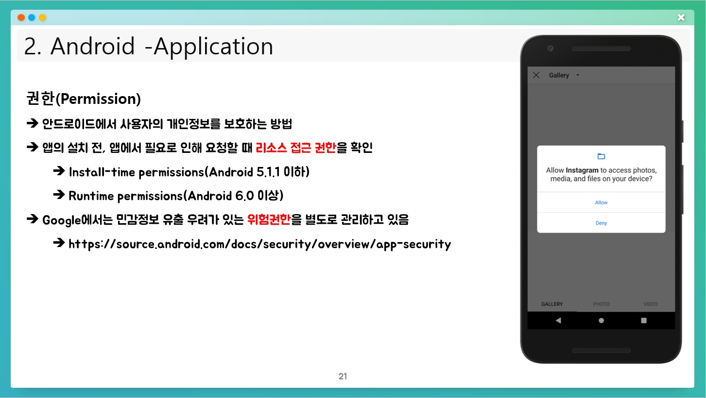 - 앱에서 사용하지 않는 권한 사용 및 과도한 권한이 부여된 경우